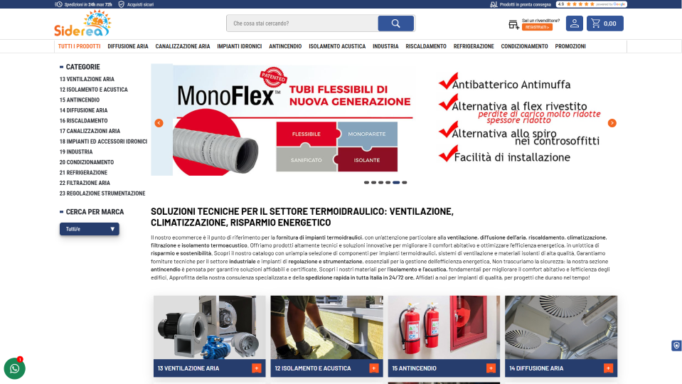 Scopri Siderea Srl, l’e-commerce di riferimento per la fornitura di impianti termoidraulici, con un’attenzione particolare alla ventilazione, diffusione dell’aria, riscaldamento, climatizzazione, filtrazione e isolamento termoacustico. Offriamo prodotti altamente tecnici e soluzioni innovative per migliorare il comfort abitativo e ottimizzare l’efficienza energetica, in un’ottica di risparmio e sostenibilità.
